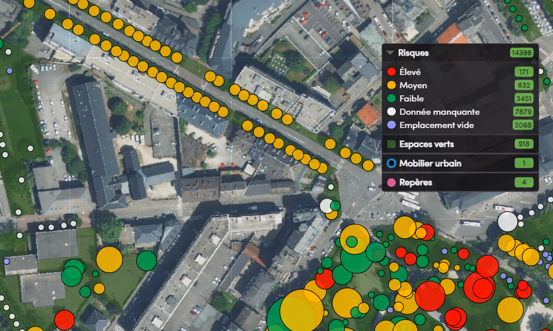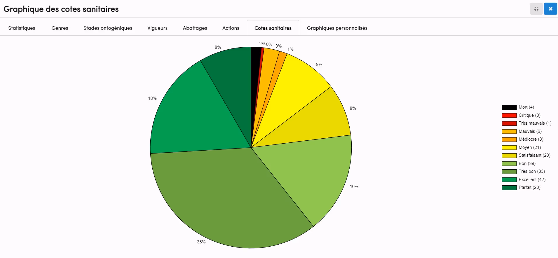 Par exemple, nous utilisons la Cote sanitaire (de 0 à 10), la notion de Risque (nul à élevé). Vous pouvez compléter cela avec vos propres métriques (suivi d'une pathologie en particulier : chenille processionnaire, chancre coloré, ...).